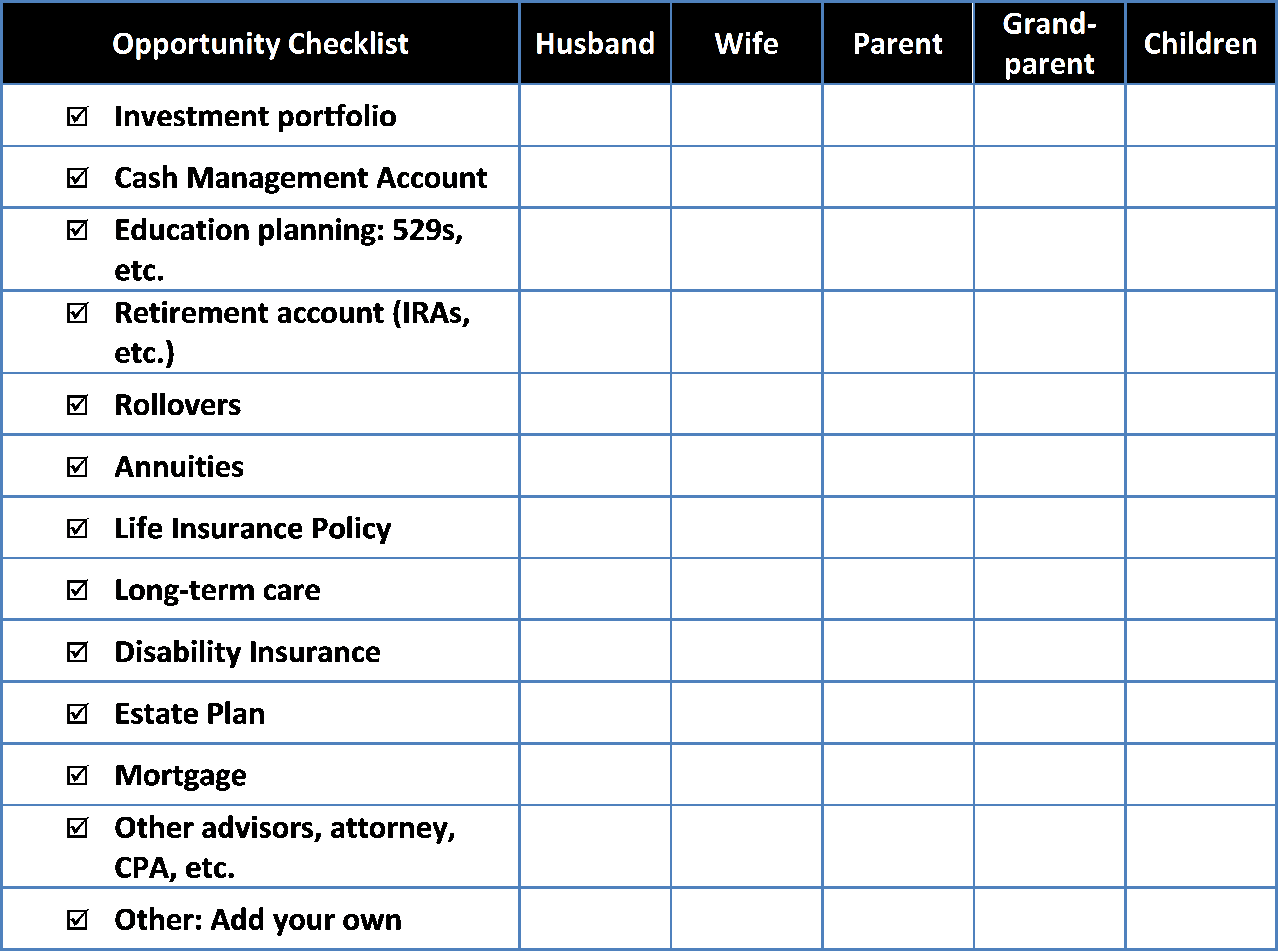 Develop a standard document with checkboxes that resides on your team’s shared folder on your network. One week prior to a client meeting, you should print this form and check the boxes of the items that you wish to include in the client file. This gives your client service associate easy instructions for this particular client meeting and saves precious communication time between the two of you.