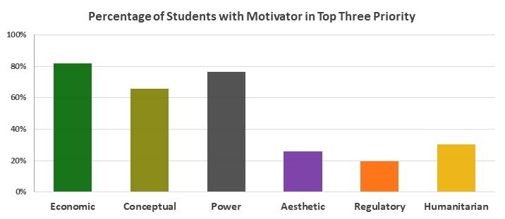 It is clear that the students enrolled in this class place an increased emphasis on the three individually oriented motivators: Economic, Conceptual, and Power. More than twice as many students reported having one of these motivators in their top three in comparison to one of the group-oriented motivators (Aesthetic, Regulatory, and Humanitarian). This indicates that as a whole, students in this class are more focused on achieving their own goals than working together to further the entire group. The results of these assessments can help to shed some light on many characteristics of millennials that may perplex members of other generations.